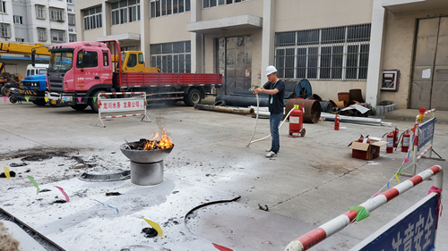安全主任夏陽華現場講解防火、消防知識,并進行示范。龍泉公司職工開始進行消防演練。演練人站在預備點發現著火;跑到消防箱提滅火器;確認滅火器合格可用;向目標火源方向跑去邊搖動滅火器;到目標火源后繞到火源風向上方,拔下滅火器插銷,將滅火器管口對準火源噴射把火撲滅。 最后,將演練火種全部熄滅,清除現場所有雜物,恢復正常狀態。