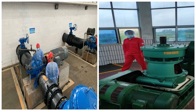 圖六:二水廠設備組成員檢查機泵運行狀況           圖七:三水廠設備組成員檢查機泵運行狀況